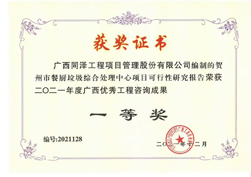 賀州市餐廚垃圾綜合處理中心項目榮獲2021年度廣西優(yōu)秀工程咨詢(xún)成果一等獎