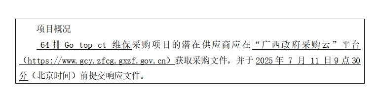 簡(jiǎn)要規格描述或項目基本概況介紹、用途:64排Go top ct 維保1項。如需進(jìn)一步了解詳細內容,詳見(jiàn)競爭性磋商文件。