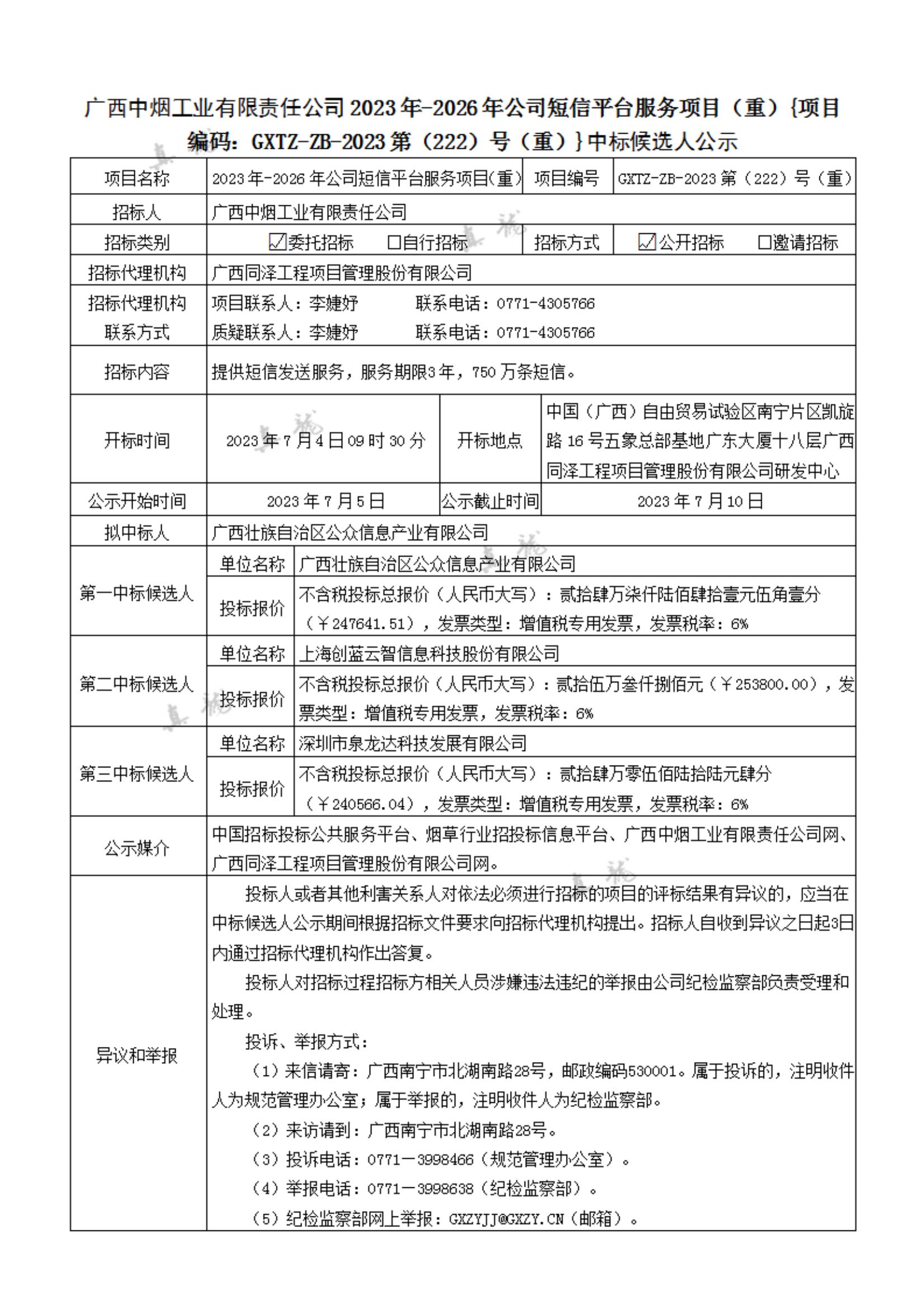廣西中煙工業(yè)有限責任公司2023年-2026年公司短信平臺服務(wù)項目(重){項目編碼:GXTZ-ZB-2023第(222)號(重)}中標候選人公示