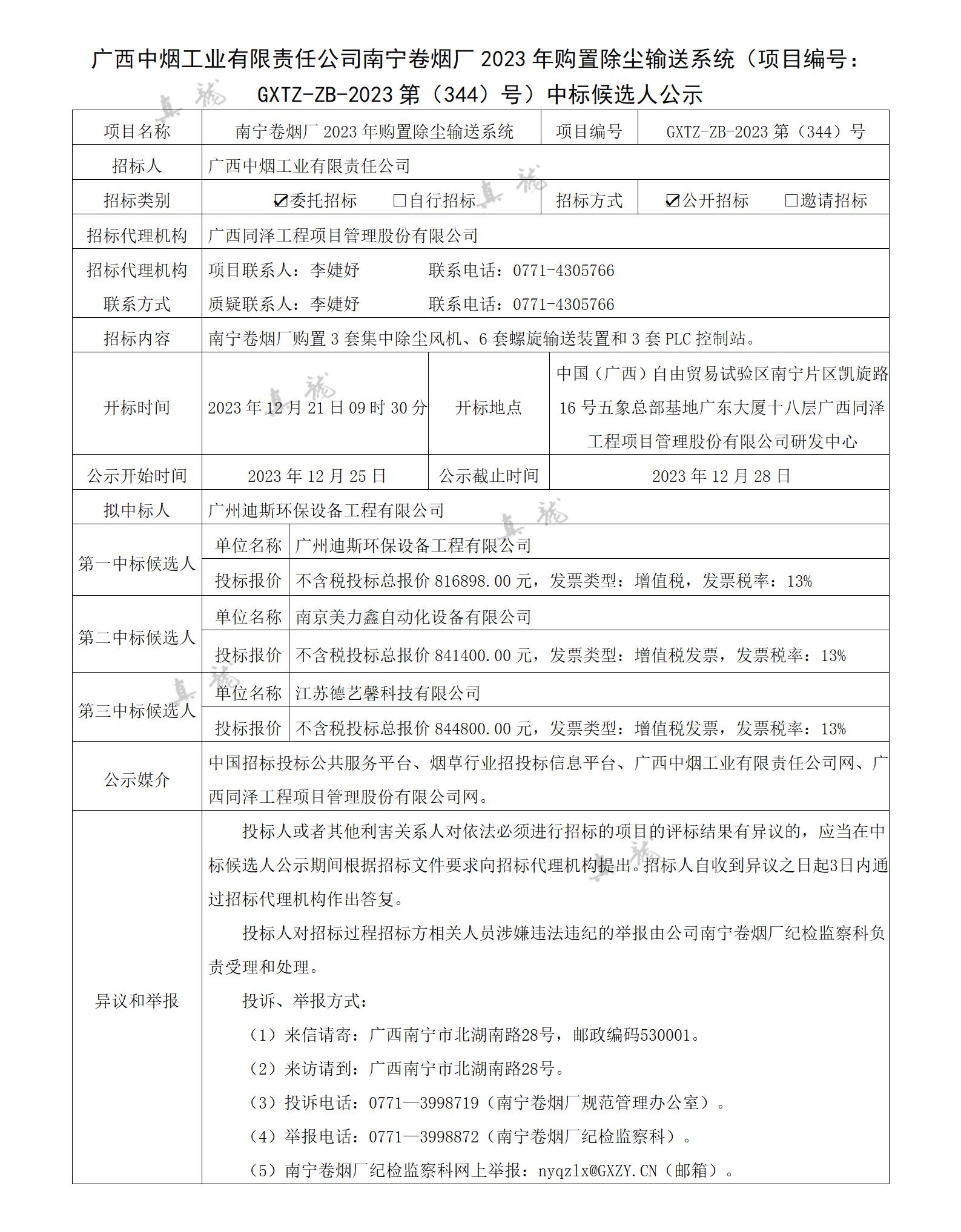 廣西中煙工業(yè)有限責任公司南寧卷煙廠(chǎng)2023年購置除塵輸送系統(項目編號:GXTZ-ZB-2023第(344)號)中標候選人公示
