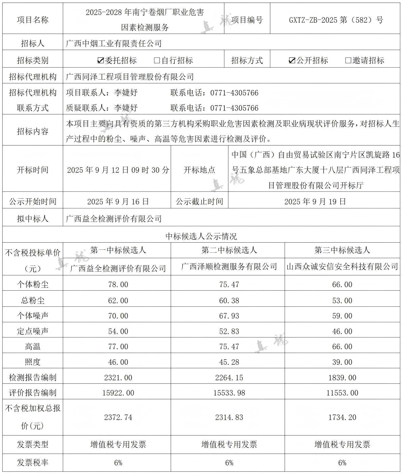 廣西中煙工業(yè)有限責任公司2025-2028年南寧卷煙廠(chǎng)職業(yè)危害因素檢測服務(wù)(項目編號:GXTZ-ZB-2025第(582)號)中標候選人公示