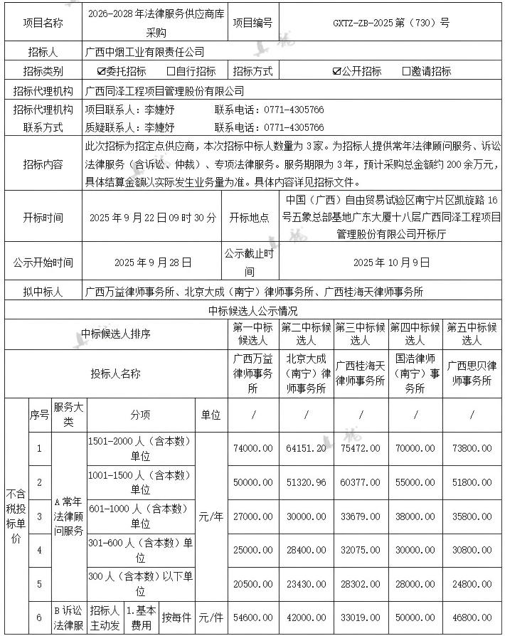 廣西中煙工業(yè)有限責任公司2026-2028年法律服務(wù)供應商庫采購(項目編號:GXTZ-ZB-2025第(730)號)中標候選人公示